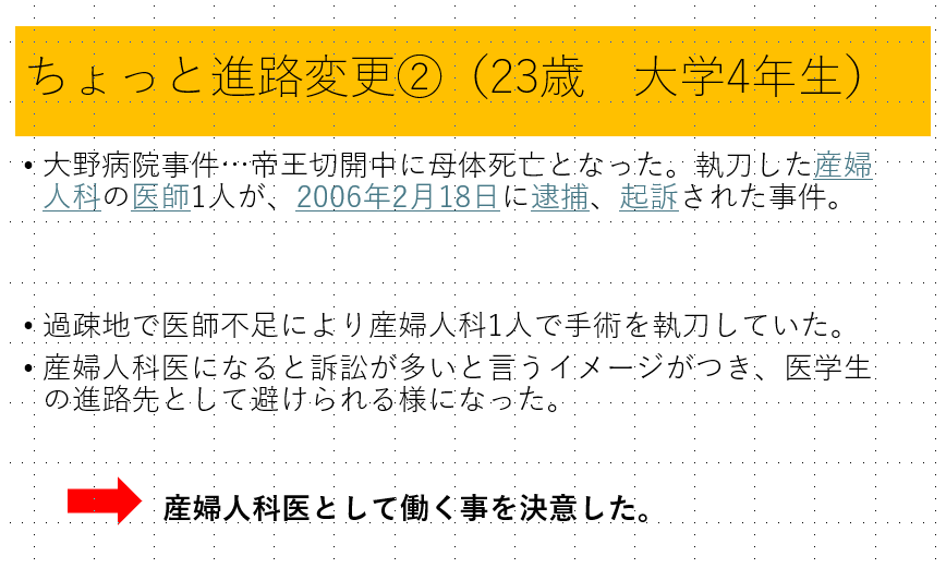 「医師」と一言で言っても、内科、外科、皮膚科、精神科など、色々な科がありますが、能代先生が産婦人科を目指すきっかけとなった背景として、2004年、過疎地域にあった福島県立大野病院で、帝王切開手術を受けた産婦が死亡し、産婦人科医が逮捕されるという痛ましい事件があったということを教えていただきました。