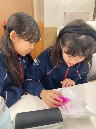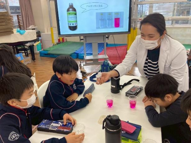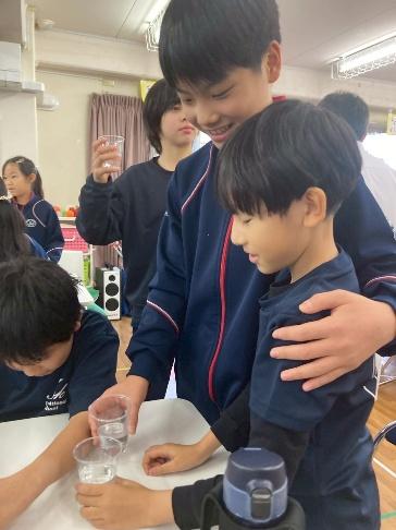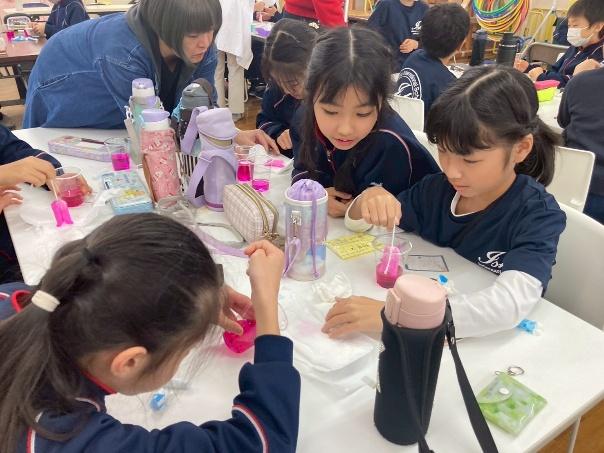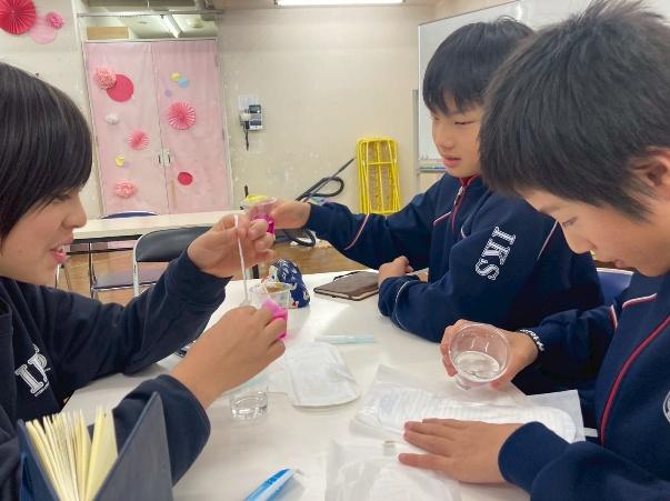 次に、能代先生から感染症がどのように広まるかについて色水を使った実験で教わりました。この実験では、目に見えないウィルスがどのように広がっていくかが可視化でき、子ども達も大変盛り上がっていました。