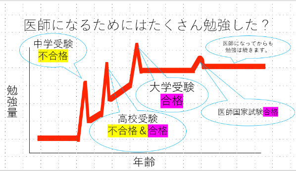 能代知美先生からも、お父様同様、医師になるまでの道のりについて、勉強量と受験の合格・不合格をグラフで紹介していただきました。